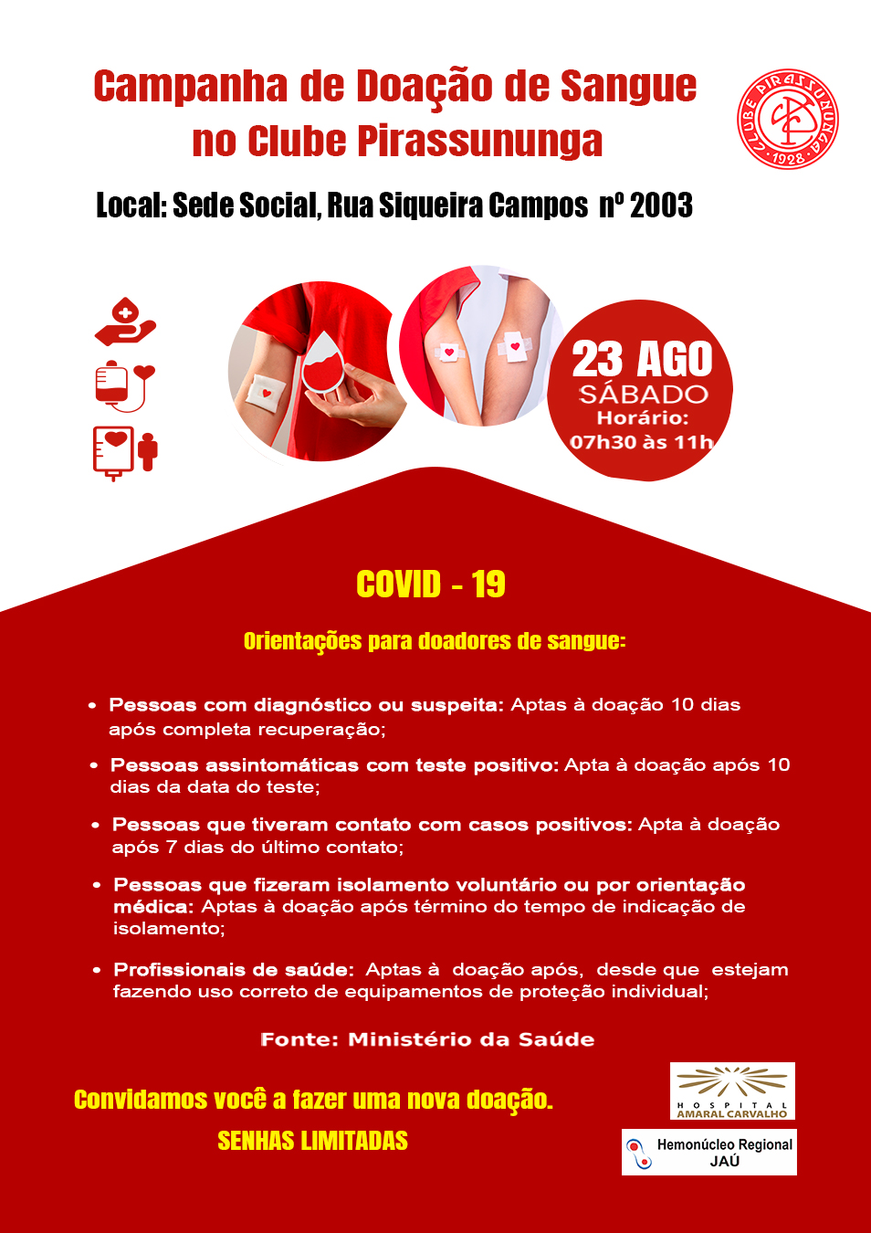 O Clube Pirassununga, em parceria com o Hemonúcleo Regional de Jaú e o Hospital Amaral Carvalho, convida você para um gesto simples, mas que transforma destinos: a nossa Campanha de Doação de Sangue! @amaral.carvalho