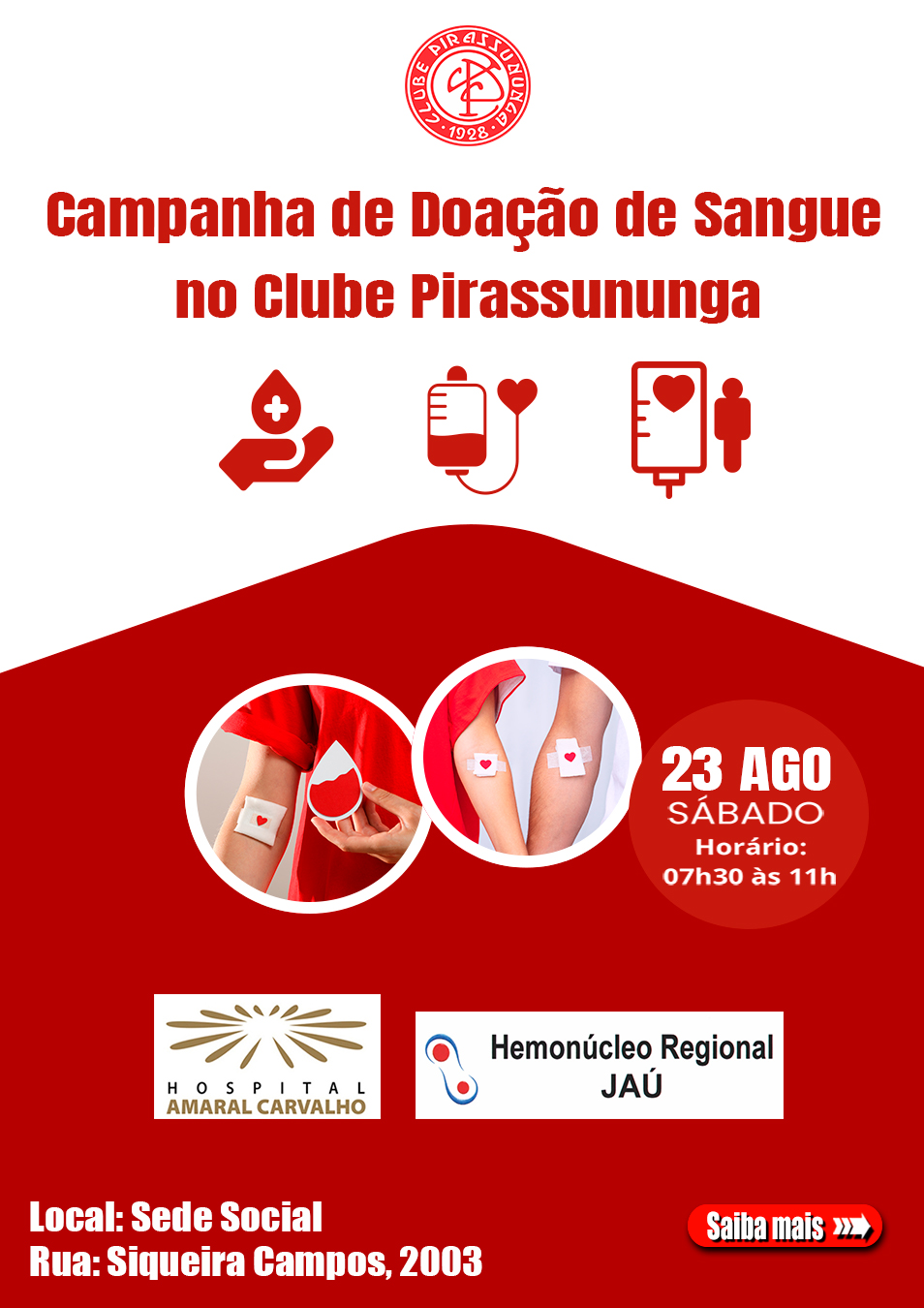 O Clube Pirassununga, em parceria com o Hemonúcleo Regional de Jaú e o Hospital Amaral Carvalho, convida você para um gesto simples, mas que transforma destinos: a nossa Campanha de Doação de Sangue! @amaral.carvalho