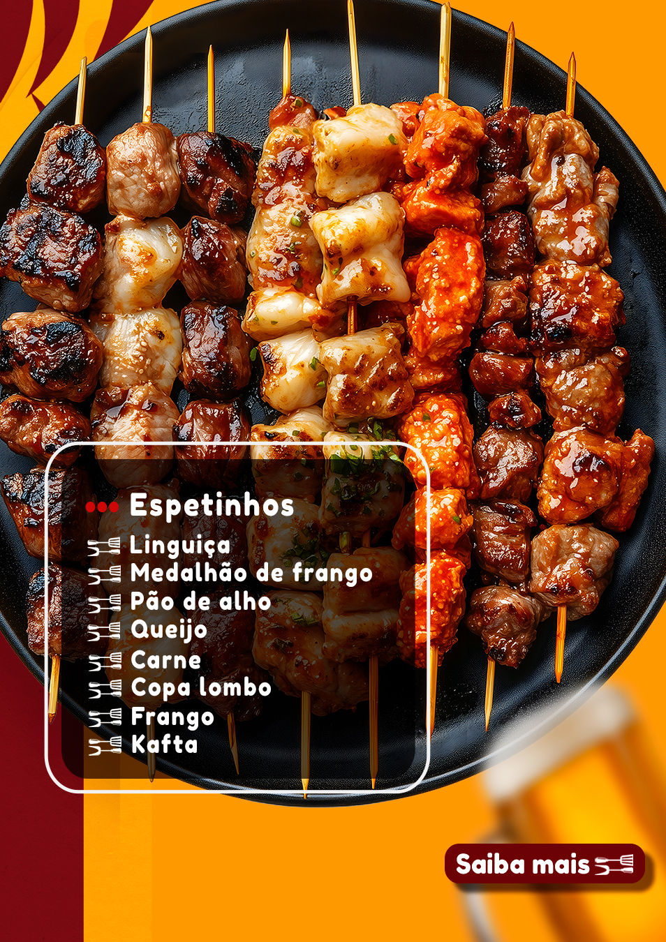 🍢 Uma variedade incrível de espetinhos: carne, frango, copa lombo, linguiça, kafta, medalhão de frango, queijo e pão de alho!