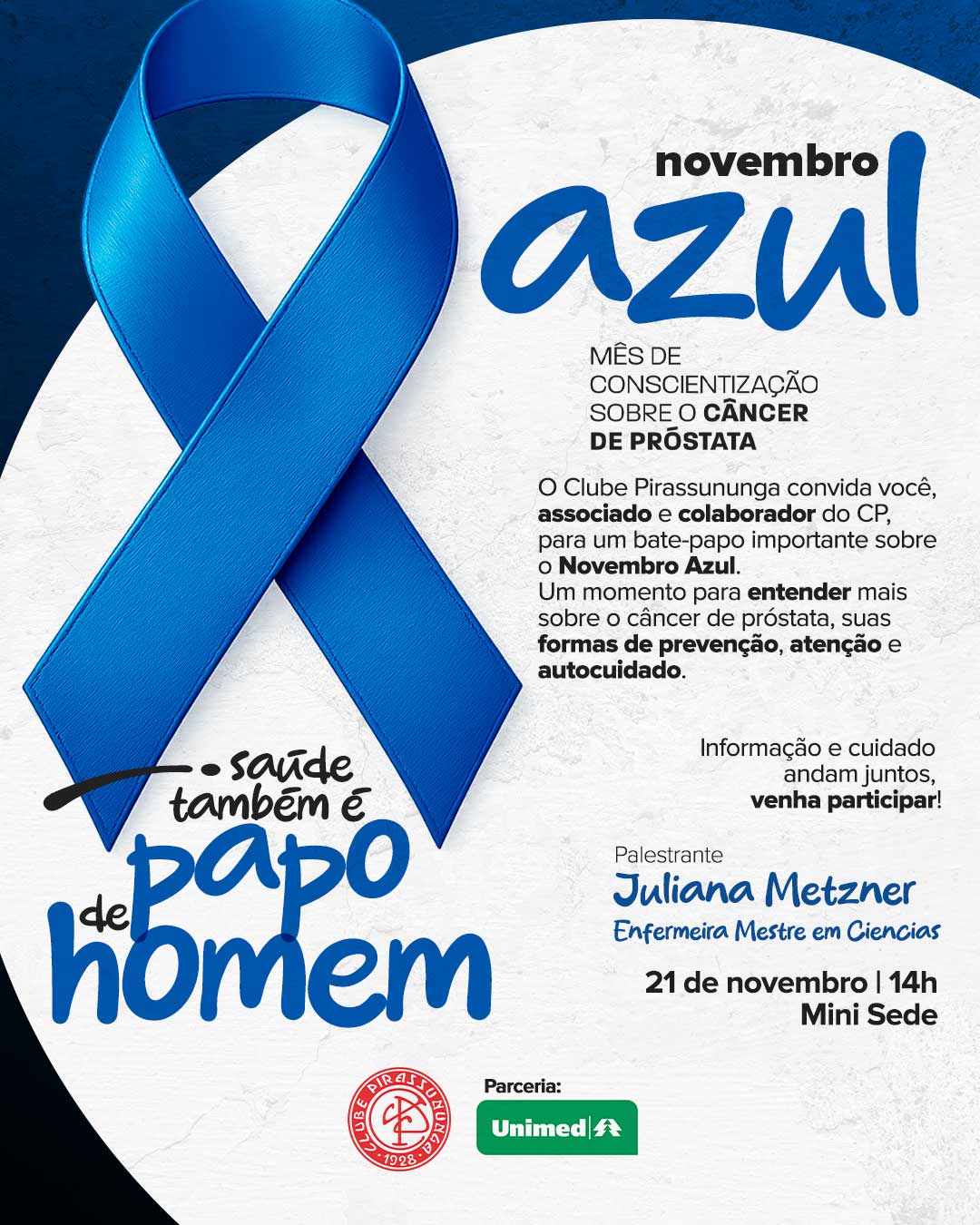 O Clube Pirassununga convida associados e colaboradores para um bate-papo especial sobre o Novembro Azul, com a palestrante Juliana Metzner, enfermeira mestre em ciências.