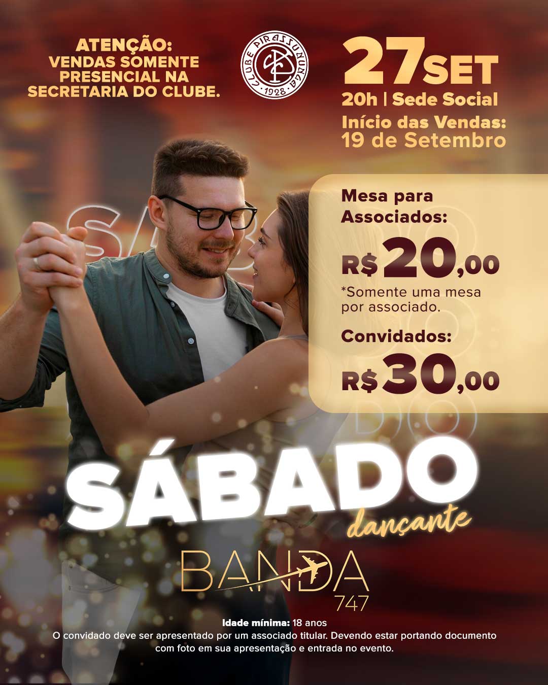 O Clube Pirassununga convida você para uma noite inesquecível com muito ritmo, alegria e boa companhia: Sábado Dançante com a Banda 747! 🎤🎸