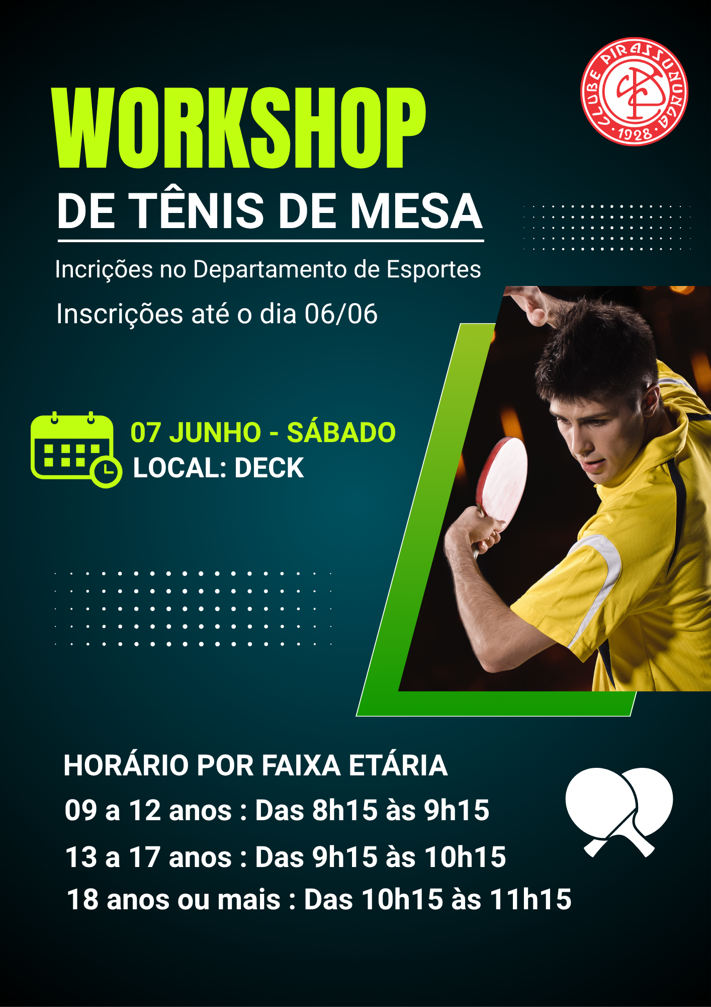 🎯 Nosso Workshop de Tênis de Mesa será no dia 07 de junho (sábado) com turmas separadas por faixa etária para você aproveitar ao máximo: