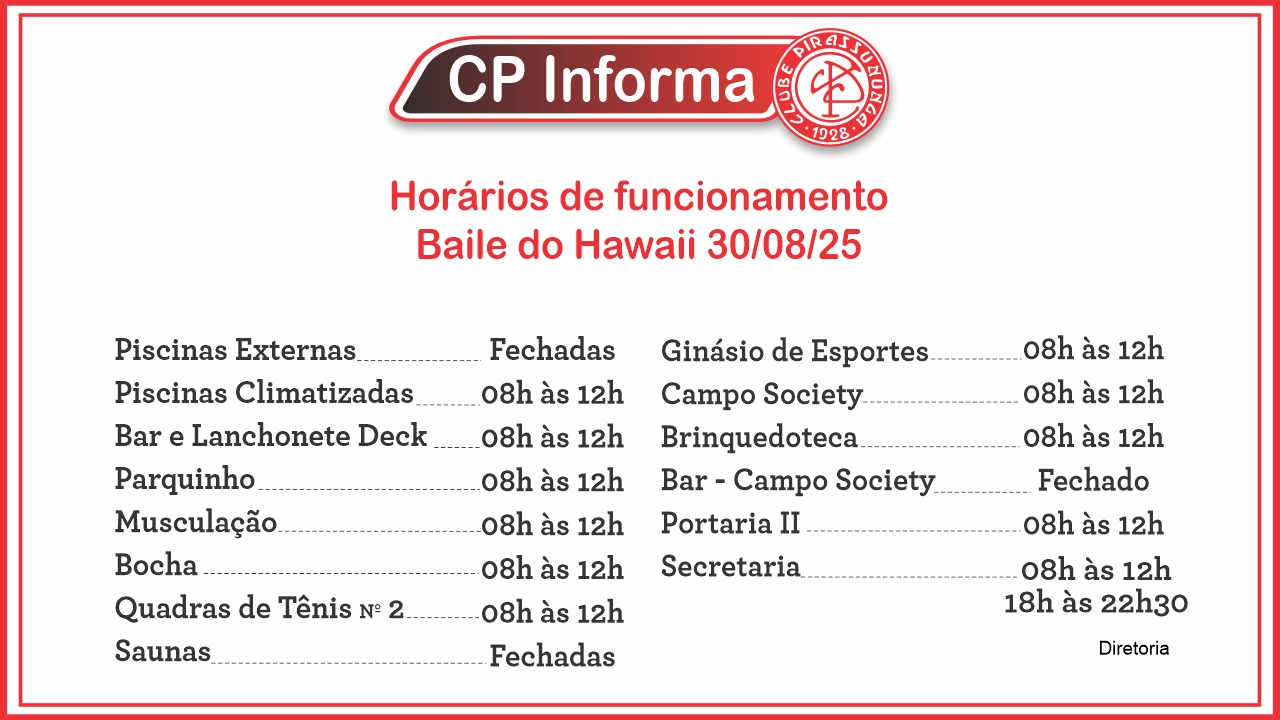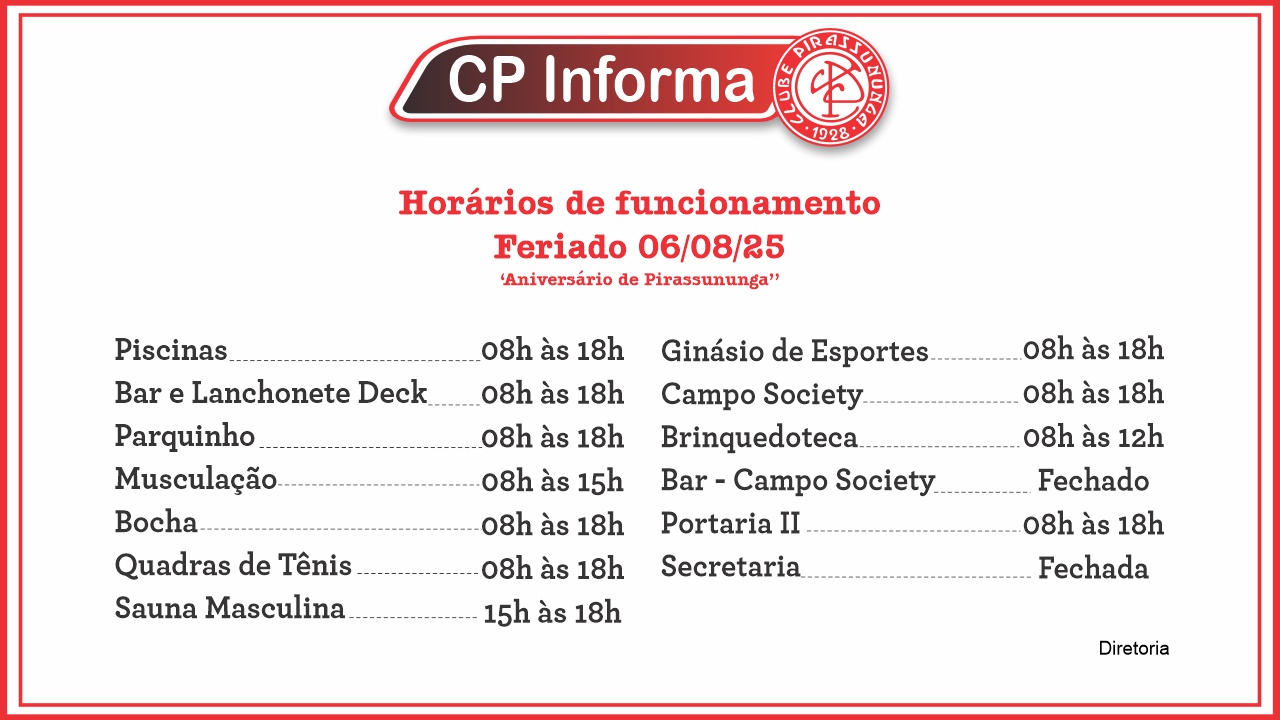 Horário de Funcionamento do Clube – Sábado, 30/08